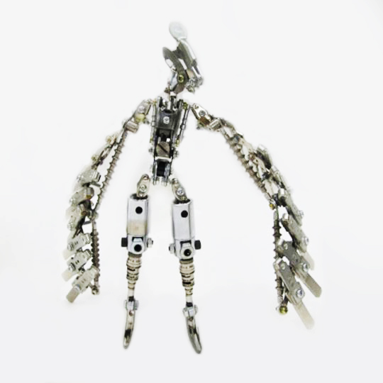 Shihirhira Daisuke使用工業和模型技術製作模型,不僅是外形,還包括內部結構。 所使用的零件是從一堆廢料中拾取的金屬零件,並且可以通過連接螺釘和螺母移動接縫,從而可以自由擺放姿勢。