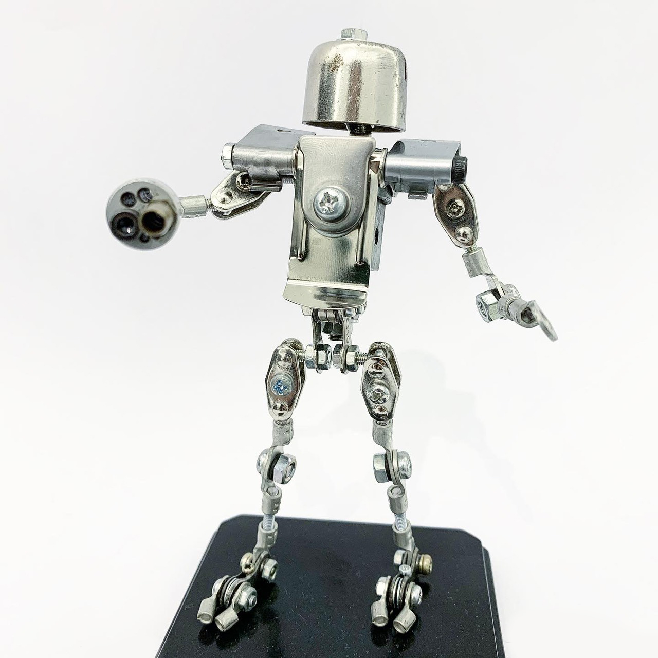Little Boy 13-30-下平大輔 從武器、造型甚至到表情等,由各種不同廢棄零件創作,每個關節皆可任意移動。 ✧作品外有壓克力框保護 底座亦有藝術家簽名 以驚人品味和技巧而聲名大噪的下平大輔自幼受鐵匠祖父的啟發,擅長處理鐵器相關材料,其創作風格主要為“廃棄藝術”,作品中使用的材料源自於散落在垃圾場的廢棄零件,如建築物、工程機械、汽車、摩托車、家用電器等產品。在以往工業社會背景下,工匠們往往花費大量的時間和精力製作單個組件,再投入到工業產品中賦予其生命,然而隨著時間流逝這些生命最終凋零成廢棄零件。下平大輔賦予這些零件一個嶄新的生命超越原有的基因。從他的作品我們可以如面臨死亡深淵時的思考,有時它甚至可以是一面鏡子,反映觀者自己對生死的看法,並見證“將死亡奉為營養,超越生死”。 理解其作品的關鍵是「升檔」和“生死”同等重要(升檔是指駕駛手動車時換檔的動作)。下平大輔成功地充實了這些曾經被視為垃圾的東西,「升檔」而轉變為藝術,不排斥其原有的基因組建一個全新的樣貌,像是輪迴抑或是一種無常。有些人會通過他的作品感受到舊環境、永恆的生命以及零件的來源,該物來自何處?就像瞥見生命和自然環境週期的一部分,然而這正是隨著時代變遷而逐漸抬頭的環保意識,藉此與藝術完美結合的一環。