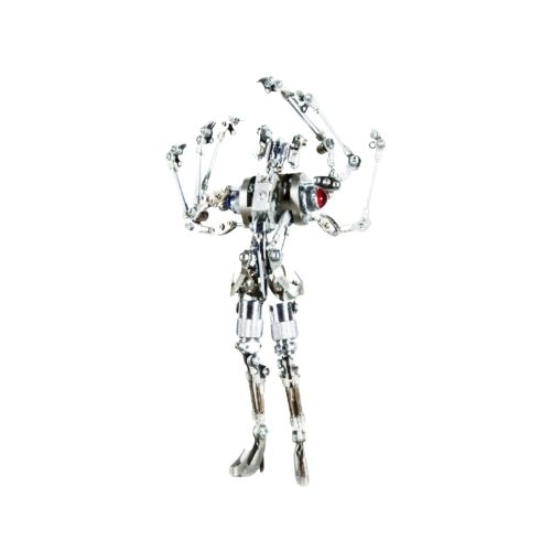 Shihirhira Daisuke使用工業和模型技術製作模型,不僅是外形,還包括內部結構。 所使用的零件是從一堆廢料中拾取的金屬零件,並且可以通過連接螺釘和螺母移動接縫,從而可以自由擺放姿勢。