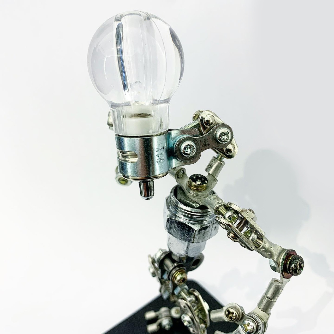 Idea man 13-06-下平大輔 從整體造型甚至到表情等,由各種不同廢棄零件創作,每個關節皆可任意移動,頭部也可發亮。 ✧作品外有壓克力框保護 底座亦有藝術家簽名 以驚人品味和技巧而聲名大噪的下平大輔自幼受鐵匠祖父的啟發,擅長處理鐵器相關材料,其創作風格主要為“廃棄藝術”,作品中使用的材料源自於散落在垃圾場的廢棄零件,如建築物、工程機械、汽車、摩托車、家用電器等產品。在以往工業社會背景下,工匠們往往花費大量的時間和精力製作單個組件,再投入到工業產品中賦予其生命,然而隨著時間流逝這些生命最終凋零成廢棄零件。下平大輔賦予這些零件一個嶄新的生命超越原有的基因。從他的作品我們可以如面臨死亡深淵時的思考,有時它甚至可以是一面鏡子,反映觀者自己對生死的看法,並見證“將死亡奉為營養,超越生死”。 理解其作品的關鍵是「升檔」和“生死”同等重要(升檔是指駕駛手動車時換檔的動作)。下平大輔成功地充實了這些曾經被視為垃圾的東西,「升檔」而轉變為藝術,不排斥其原有的基因組建一個全新的樣貌,像是輪迴抑或是一種無常。有些人會通過他的作品感受到舊環境、永恆的生命以及零件的來源,該物來自何處?就像瞥見生命和自然環境週期的一部分,然而這正是隨著時代變遷而逐漸抬頭的環保意識,藉此與藝術完美結合的一環。