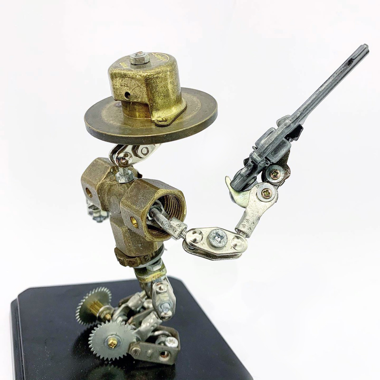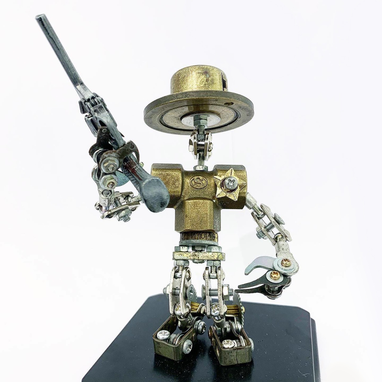Sticks and Stones 12-02-下平大輔 帽子配上手槍搭配齒輪造型的雙腳,頗有墨西哥大佬的風範,從武器、造型甚至到表情等,由各種不同廢棄零件創作,每個關節皆可任意移動。 ✧作品外有壓克力框保護 底座亦有藝術家簽名 以驚人品味和技巧而聲名大噪的下平大輔自幼受鐵匠祖父的啟發,擅長處理鐵器相關材料,其創作風格主要為“廃棄藝術”,作品中使用的材料源自於散落在垃圾場的廢棄零件,如建築物、工程機械、汽車、摩托車、家用電器等產品。在以往工業社會背景下,工匠們往往花費大量的時間和精力製作單個組件,再投入到工業產品中賦予其生命,然而隨著時間流逝這些生命最終凋零成廢棄零件。下平大輔賦予這些零件一個嶄新的生命超越原有的基因。從他的作品我們可以如面臨死亡深淵時的思考,有時它甚至可以是一面鏡子,反映觀者自己對生死的看法,並見證“將死亡奉為營養,超越生死”。 理解其作品的關鍵是「升檔」和“生死”同等重要(升檔是指駕駛手動車時換檔的動作)。下平大輔成功地充實了這些曾經被視為垃圾的東西,「升檔」而轉變為藝術,不排斥其原有的基因組建一個全新的樣貌,像是輪迴抑或是一種無常。有些人會通過他的作品感受到舊環境、永恆的生命以及零件的來源,該物來自何處?就像瞥見生命和自然環境週期的一部分,然而這正是隨著時代變遷而逐漸抬頭的環保意識,藉此與藝術完美結合的一環。