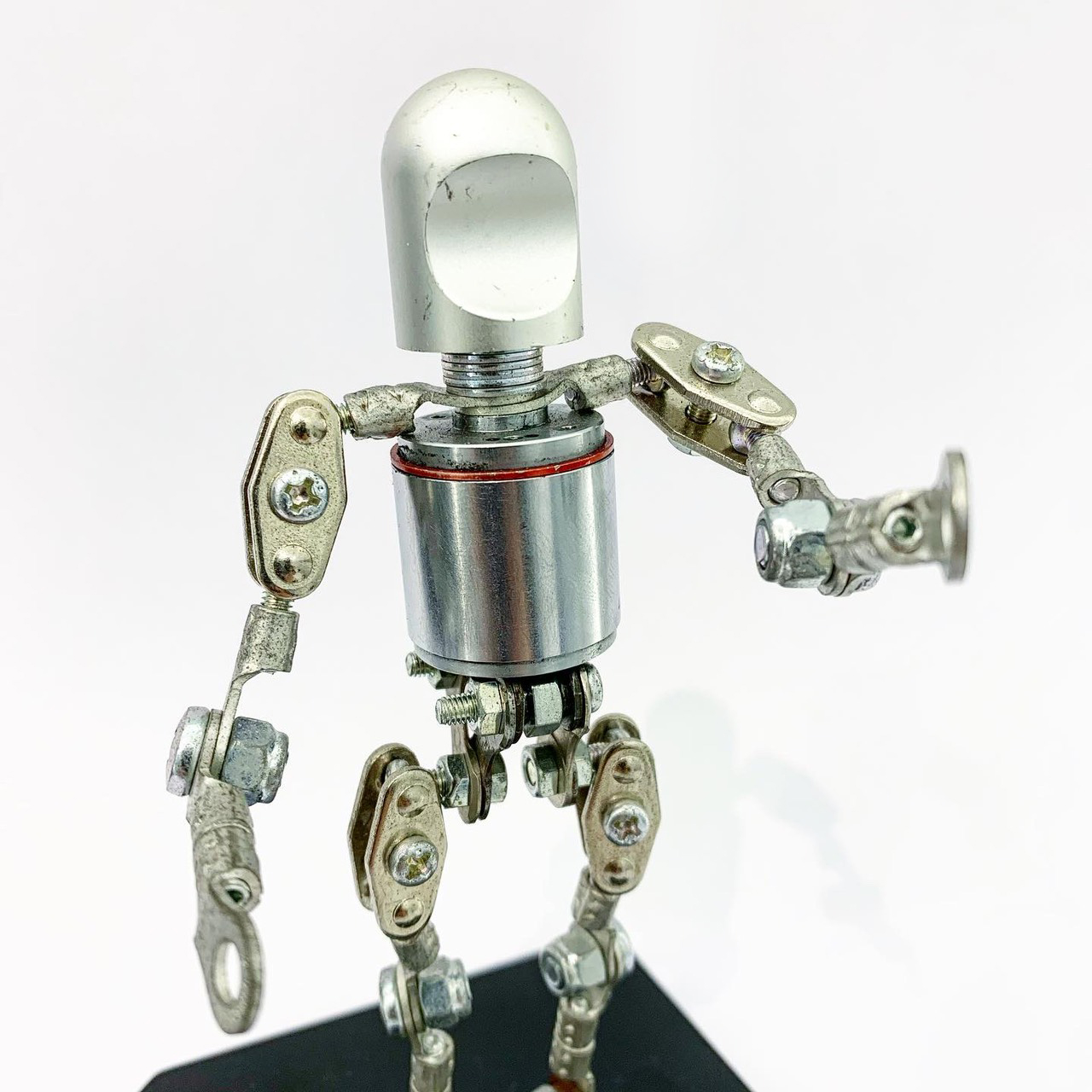 Little Boy 19-02-下平大輔 從造型到姿勢甚由各種不同廢棄零件創作,每個關節皆可任意移動。 ✧作品外有壓克力框保護 底座亦有藝術家簽名 以驚人品味和技巧而聲名大噪的下平大輔自幼受鐵匠祖父的啟發,擅長處理鐵器相關材料,其創作風格主要為“廃棄藝術”,作品中使用的材料源自於散落在垃圾場的廢棄零件,如建築物、工程機械、汽車、摩托車、家用電器等產品。在以往工業社會背景下,工匠們往往花費大量的時間和精力製作單個組件,再投入到工業產品中賦予其生命,然而隨著時間流逝這些生命最終凋零成廢棄零件。下平大輔賦予這些零件一個嶄新的生命超越原有的基因。從他的作品我們可以如面臨死亡深淵時的思考,有時它甚至可以是一面鏡子,反映觀者自己對生死的看法,並見證“將死亡奉為營養,超越生死”。 理解其作品的關鍵是「升檔」和“生死”同等重要(升檔是指駕駛手動車時換檔的動作)。下平大輔成功地充實了這些曾經被視為垃圾的東西,「升檔」而轉變為藝術,不排斥其原有的基因組建一個全新的樣貌,像是輪迴抑或是一種無常。有些人會通過他的作品感受到舊環境、永恆的生命以及零件的來源,該物來自何處?就像瞥見生命和自然環境週期的一部分,然而這正是隨著時代變遷而逐漸抬頭的環保意識,藉此與藝術完美結合的一環。